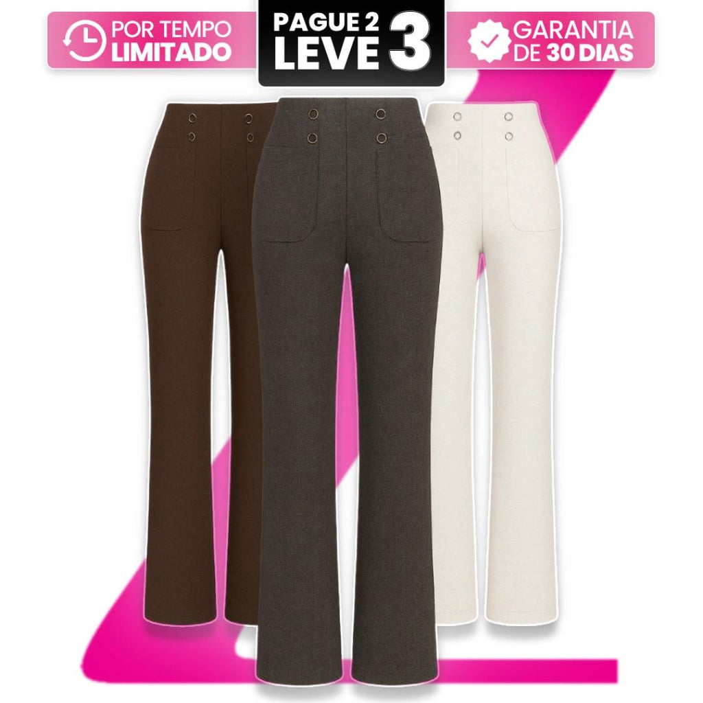 [Leve 3, Pague Só 2] Calça Solena Feminina em Algodão, Poliéster e Viscose de Cintura Alta com Botões Frontais