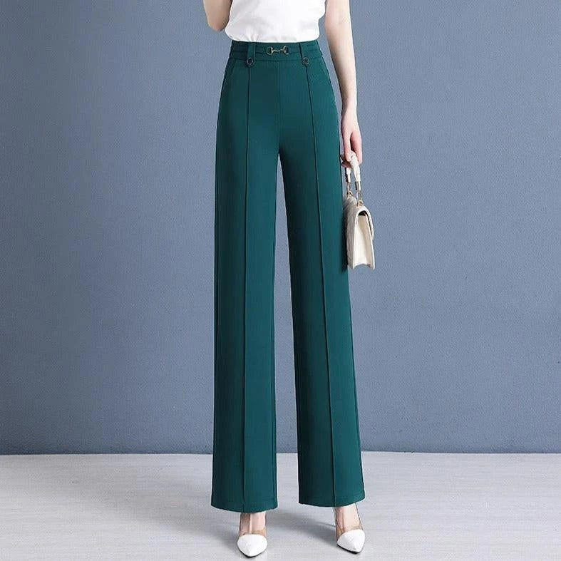 |Pague 3 Leve 5| Calças Femininas Lavina de Cintura Alta com Botões Frontais em Poliéster e Seda Gelo!